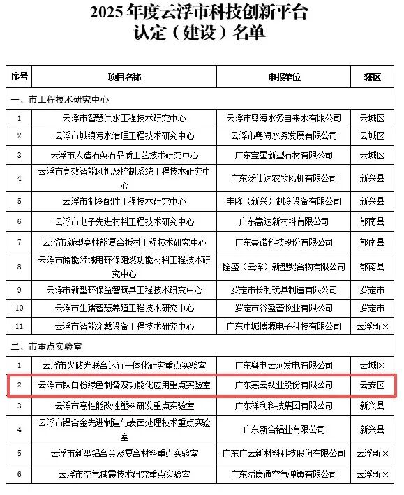 近日,云浮市科学技术局正式公布2025年度科技创新平台认定(建设)名单,广东惠云钛业(300891)股份有限公司申报的“云浮市钛白粉绿色制备及功能化应用重点实验室”成功入选“市重点实验室”,彰显了公司在钛白粉领域的技术研发实力与创新潜力。